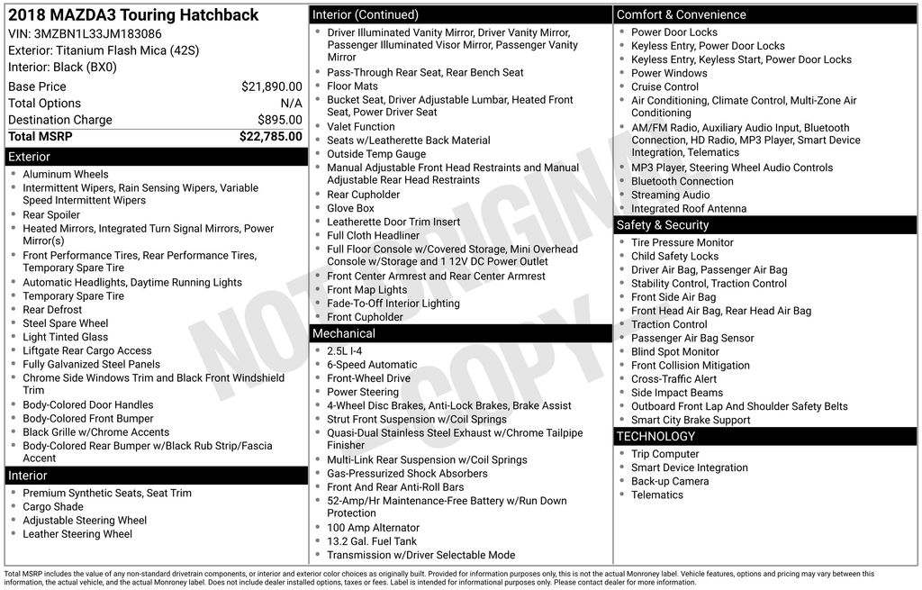 Discover the perfect blend of style, performance, and value with this exceptional 2018 Mazda Mazda3 Touring. This meticulously maintained sedan boasts a striking Brown exterior that commands attention on the road. Powered by a SKYACTIV® 2.5L 4-Cylinder DOHC 16V engine paired with a 6-Speed Automatic transmission, this Mazda3 delivers an impressive 27 city / 36 highway MPG, making it an exceptional choice for the savvy driver.